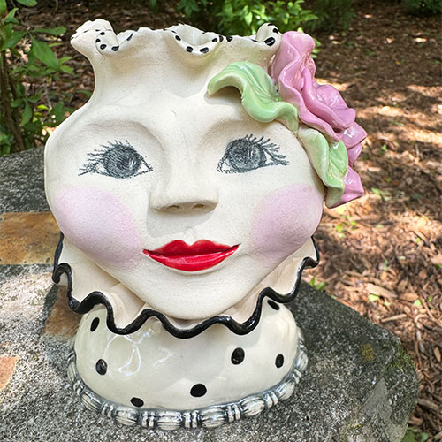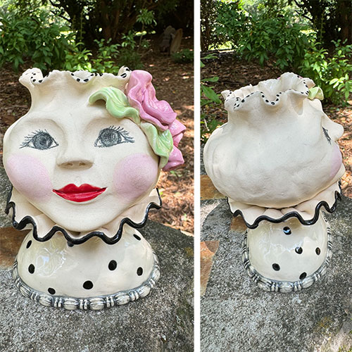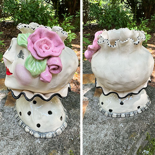 Each piece is glazed in bright pastels on the inside and matte glaze on the outside. Food safe inside. Great presentation for cotton balls, soap, candies, nuts, mini plants, etc. The piece is 6.5" tall with a 4" x 3" base.