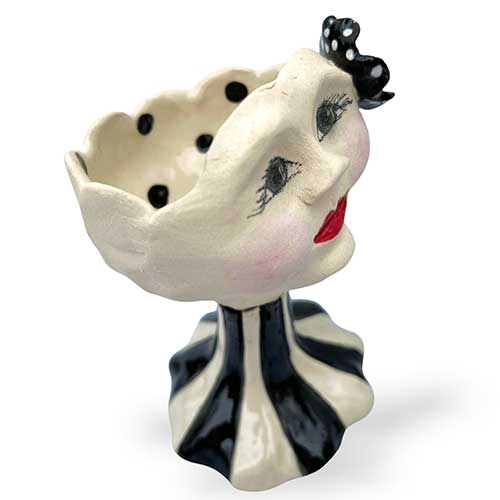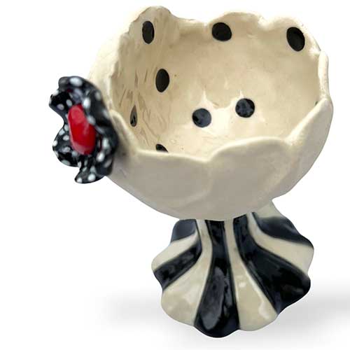 Itsy Stemware feature the same fiesty attitude of their big sisters. Just shorter. 5.5" tall. 3" base. 3" top opening. We no longer have this piece on the shelf ready to ship. Cindy will make one especially for you and ship directly from her CA studio. Please allow 3 weeks from start to finish.