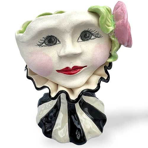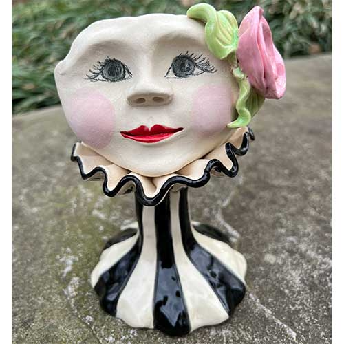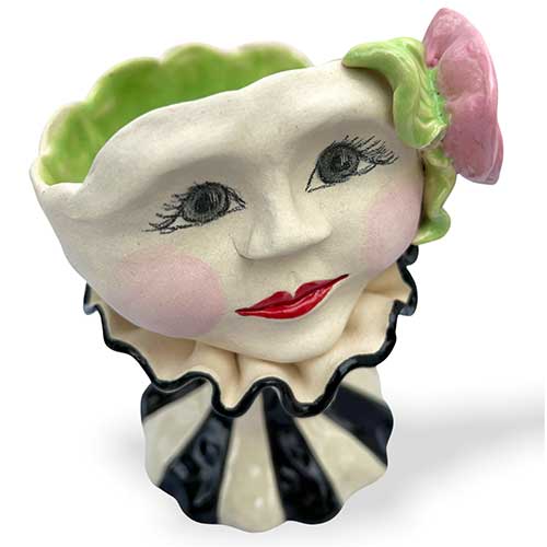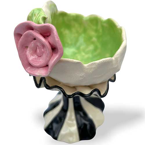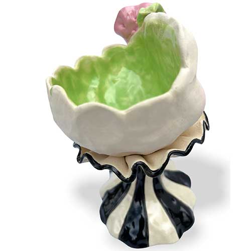 Small hand formed and sculpted stemware. Each piece is stained and glazed outside in a matte finish and interior is glossy bright pastel. Interior of the stemware is a food safe glaze and can hold candies, nuts, etc. This little muse would be charming on the bathroom counter to hold cotton balls, rings, soap petals, etc.