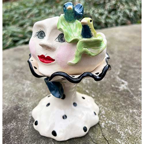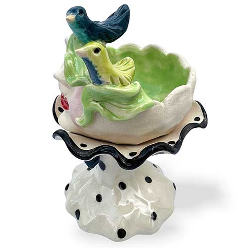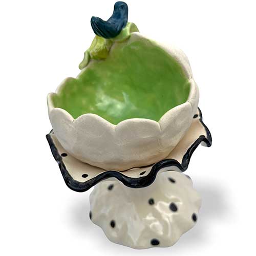 Small hand formed and sculpted stemware. Each piece is stained and glazed outside in a matte finish and interior is glossy bright pastel. Interior of the stemware is a food safe glaze and can hold candies, nuts, etc. This little muse would be charming on the bathroom counter to hold cotton balls, rings, soap petals, etc.