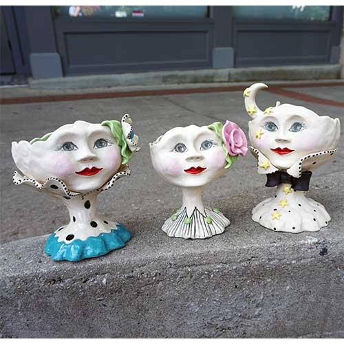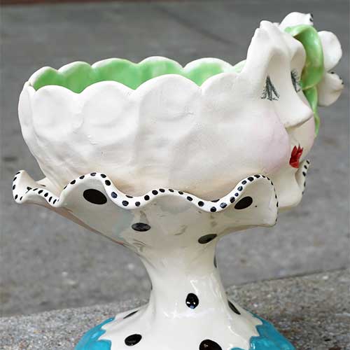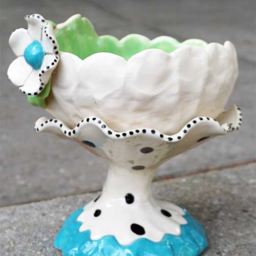 Hand sculptured stemware glazed in bright pastels on the inside and matte glaze on the outside. Food safe inside. Great presentation for wine or Champagne glasses cotton balls, soap, candies, nuts, mini plants, etc. Although the pieces are microwave and dishwasher safe, their delicate nature practically mandates hand washing as a preferred cleaning method.