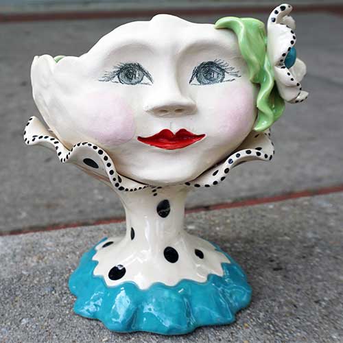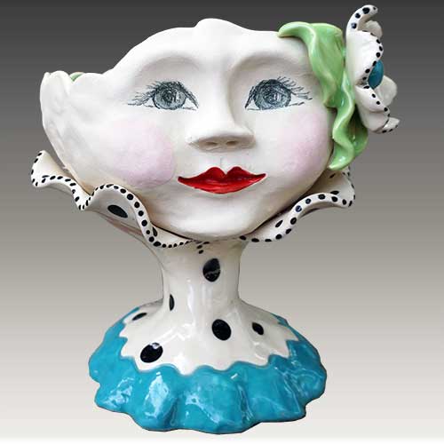 Celeste is about 6.5" tall, with the top opening being 5.25" across the top and the base 4.5" diameter. Details include a flower, a scallop collar and turquoise scallop textured base.