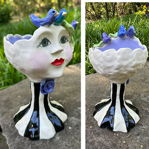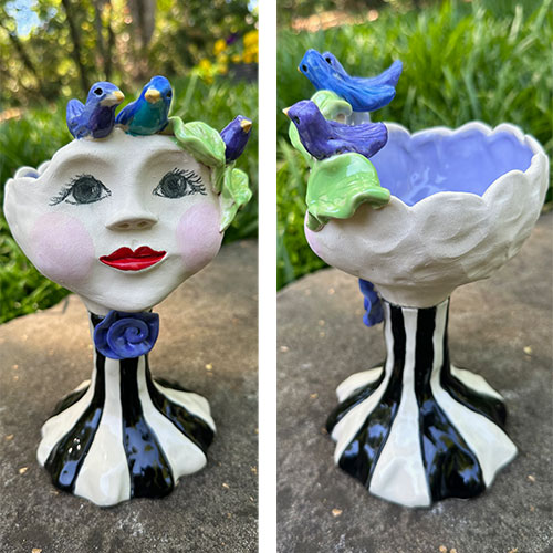 This beauty is no longer on our shelves and ready to ship but the good news is that Cindy will create one just for you and ship it from her CA studio directly to you. Please allow 3 weeks. Hand sculptured stemware glazed in bright pastels on the inside and matte glaze on the outside. Food safe inside. Great presentation for cotton balls, soap, candies, nuts, mini plants, etc. This piece is 8.25" tall with a 4.5" base and a 4.25" x 3" top opening.