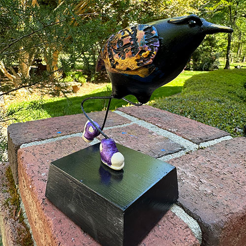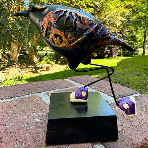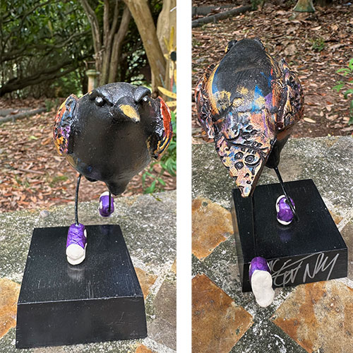 Trained in Design and Sculpture with an MFA from Otis Art Institute, Steven McGovney has worked in multiple medias, but focused on the sculptural side of ceramics. He has done whimsical ceramic art, and sculpture. The Avicularity line of bird sculptures is mixed media including clay, steel, acrylic and oil paint. Birds are intended to bring a smile. The Ravens, in particular, are such an interesting bird, carried in the myths of many peoples worldwide.
