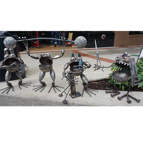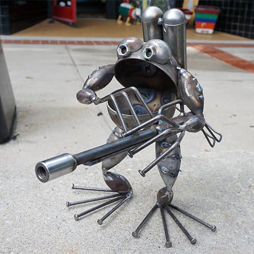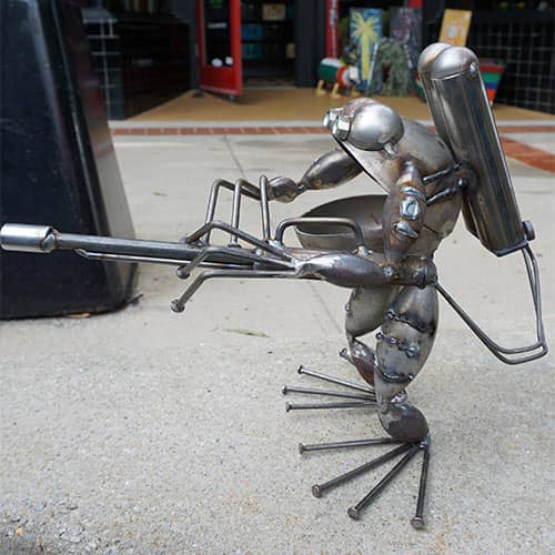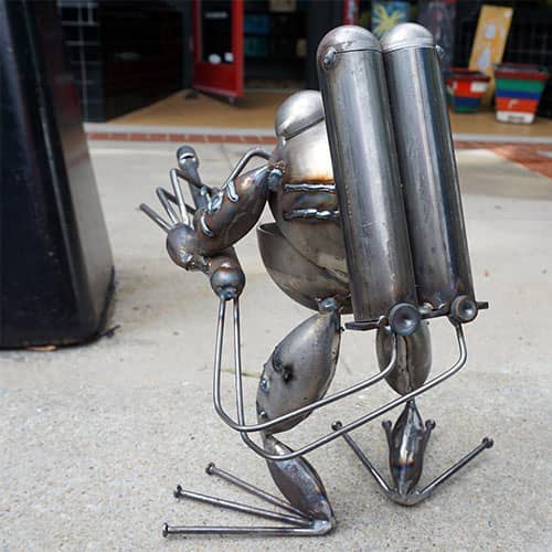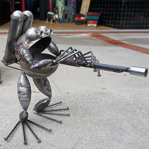 Sugar Post critters are made in Salt Lake City, Utah. All items are handmade from recycled scrap metal and vintage World War II military surplus. Most items are made from 100% post consumer waste or surplus. Some incorporate factory "seconds", or mis-cuts. All products are welded, plasma cut and assembled in the studio, and every product is signed by the artist.
