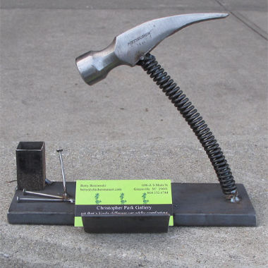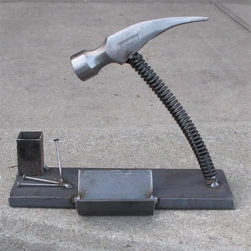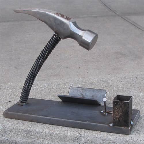 The metal base is 9" x 3" and the total height is 7.5" tall. The authentic hammer head is on a springy coil which moves towards the nail when you nudge it.