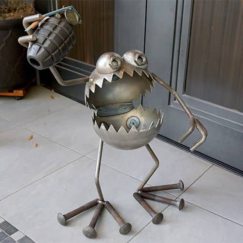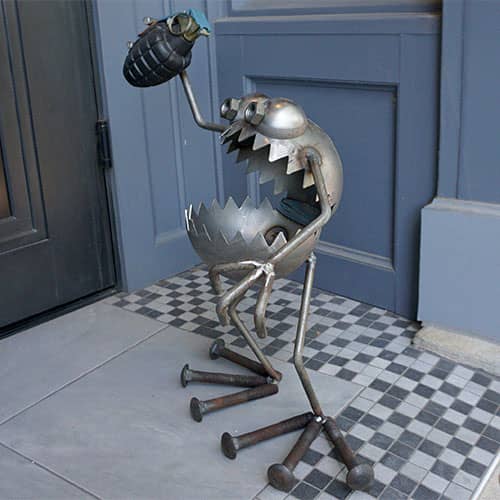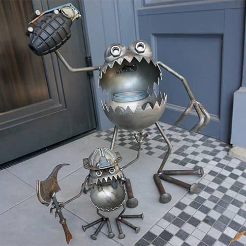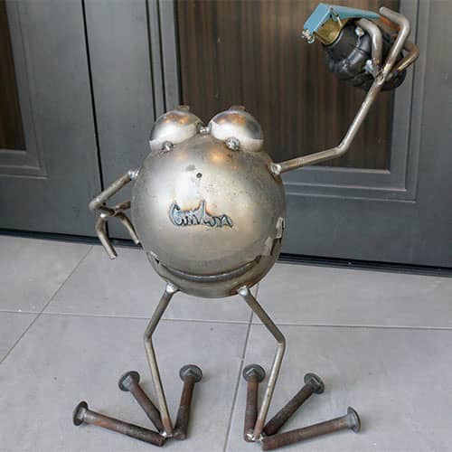 Sugar Post critters are made in Salt Lake City, Utah. All items are handmade from recycled scrap metal and vintage World War II military surplus. Most items are made from 100% post consumer waste or surplus. Some incorporate factory "seconds", or mis-cuts. All products are welded, plasma cut and assembled in the studio, and every product is signed by the artist.