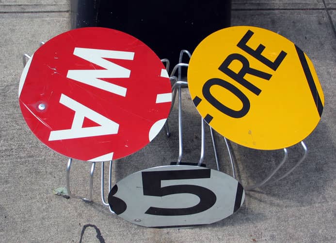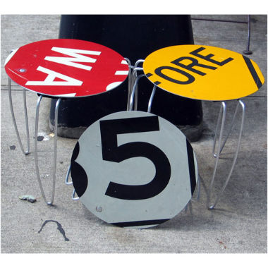 Retired Street Sign Stacking Table Made from "retired" street signs, these rugged, versatile, tables can inject some fun just about anywhere! Stack up to 4 units for easy storage and space savings. For use indoors or outdoors. Size: 15" diameter x 16" tall. Legs come off for shipping or storage. Signs pictured are the ones we have.