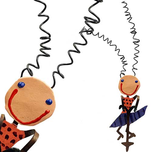 This is a collaboration between Bill and Marcia, The figures are hand cut from recycled metal, filed so there are no sharp edges, painted, and sealed. This piece is 8.5" Tall (14" tall with hair) and 3" wide. Face is plaster.