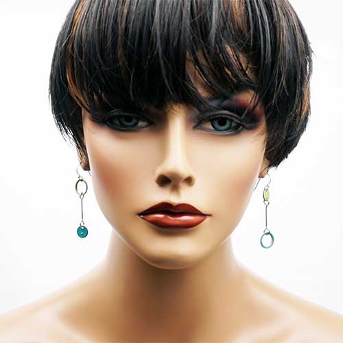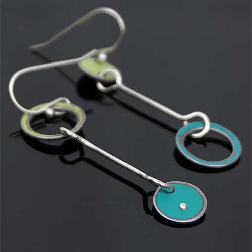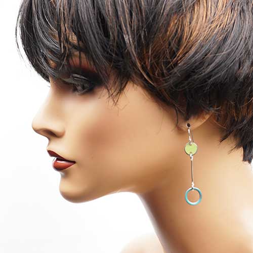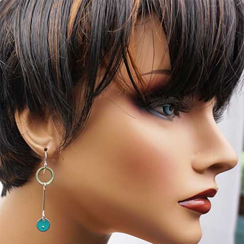 Earrings measure 2" as measured from the center of the ear wire curve. Design is 1.75" long and .5" across the widest part. Made from 1972 Plymonth (green) and 1965 Ford Econoline Supervan (turquoise)