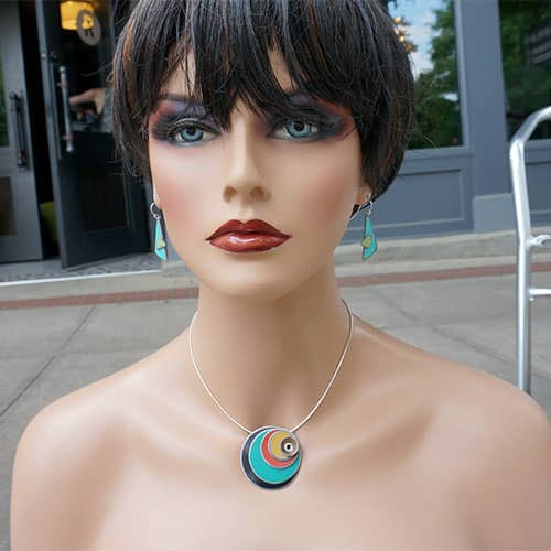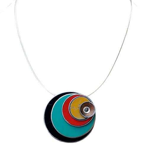 Design is 1.5" diameter on a 16" sterling silver neck wire/chain. Not adjustable.