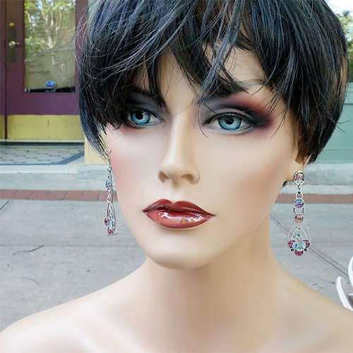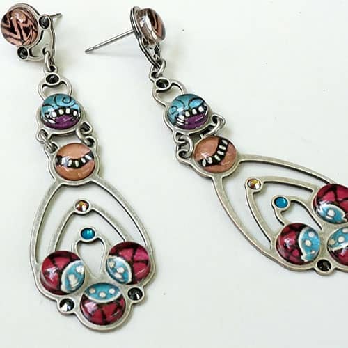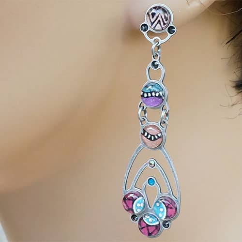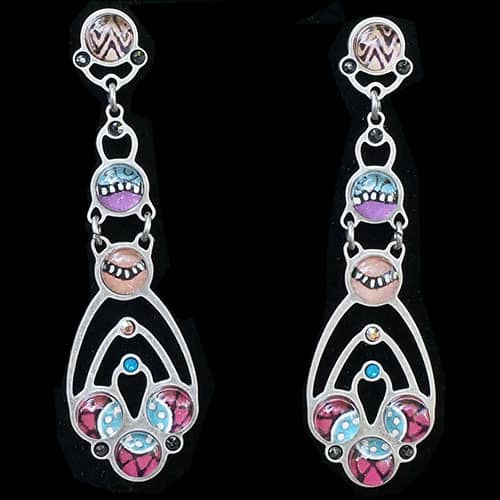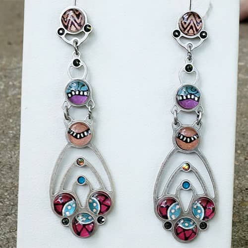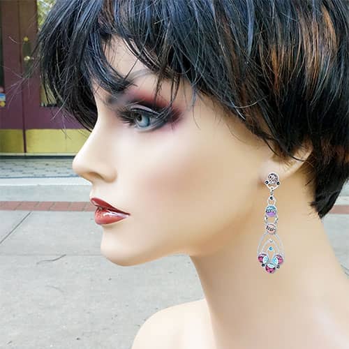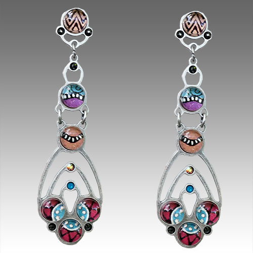 These earrings are 2.5" long measured from the top of the post to the bottom. Design is .75" wide at the bottom. Very light weight and swingy.