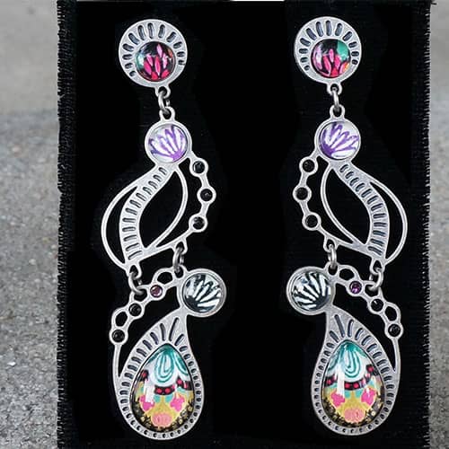 The work combines high technology and skillful hand-painting, combining laser-cut stainless steel, artist's resin, mosaic pieces and Austrian crystal.