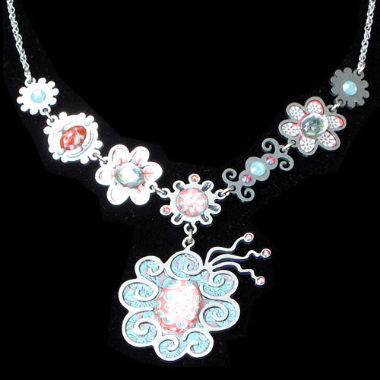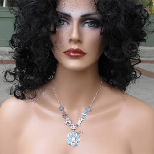 A very versatile necklace, adjustable from 15" - 18". The center drop is 2". The focal center flower is 1.25" long and wide (not including the crystal dotted "wings". Very light weight and sparkly.