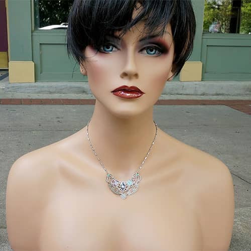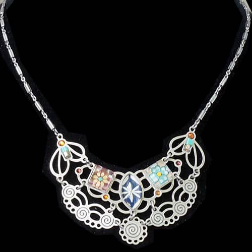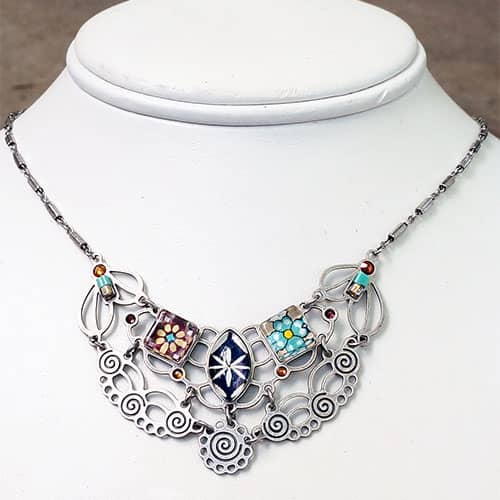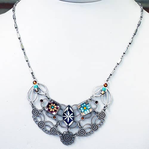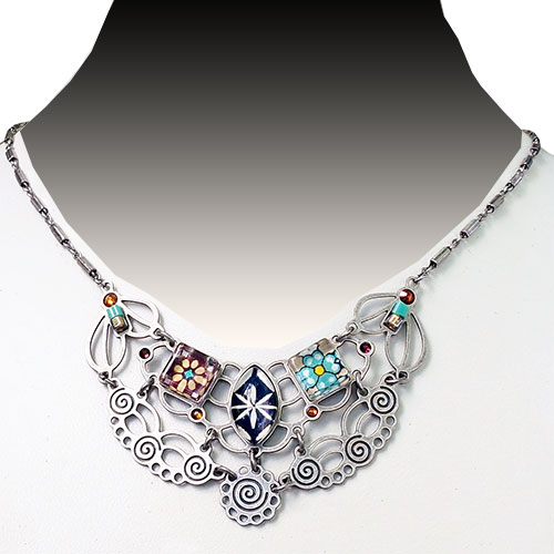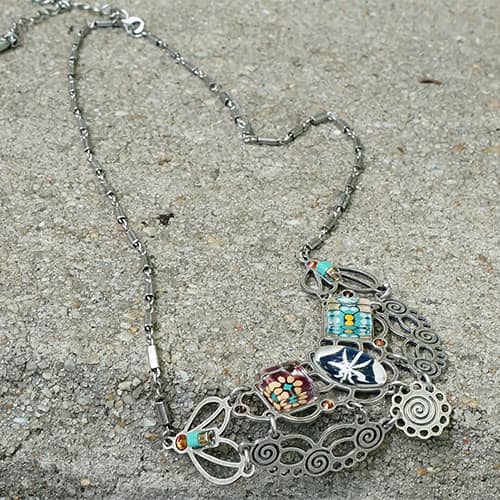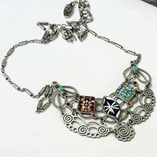 I don't know - it kinda reminds me of the necklaces we used to wear back in the hippie days. A very versatile necklace, adjustable from 17" - 21". The design is almost 2.5" wide and just over 1" long. Very light weight.