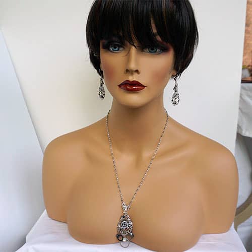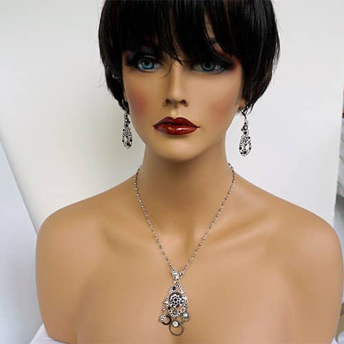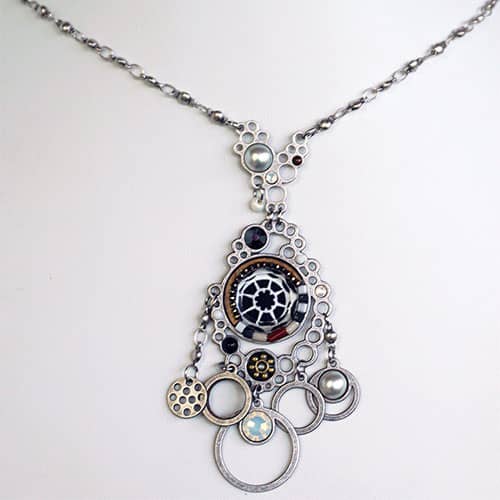 A very versatile necklace, adjustable from 16" - 20". The design is about 1.25" wide. The center front measures 3" long. Very light weight.
