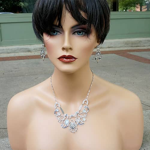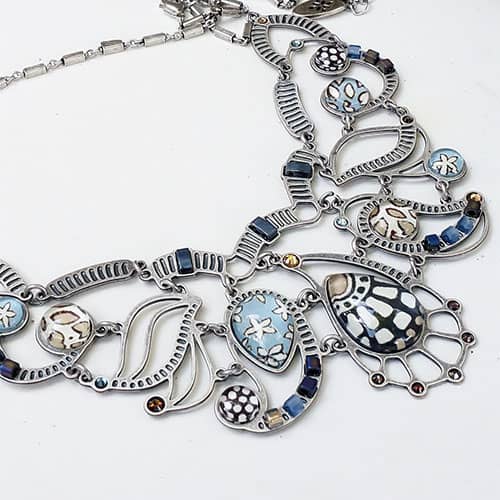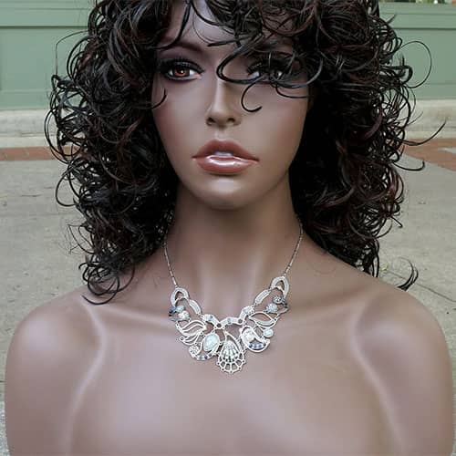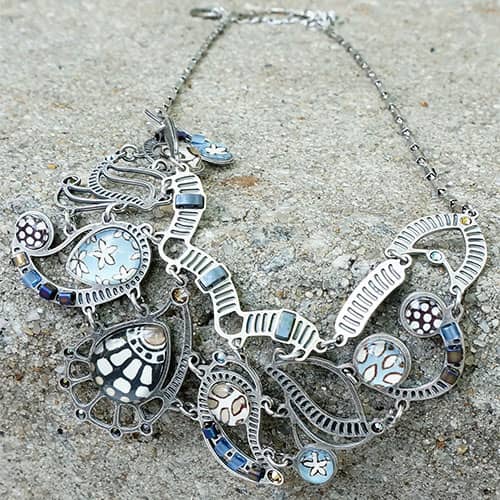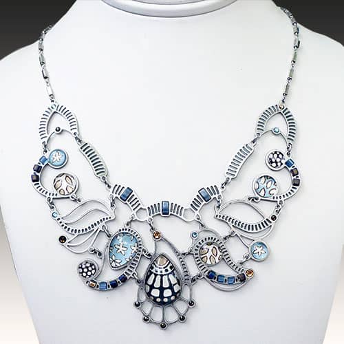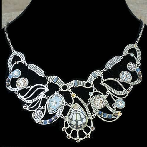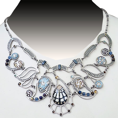 A very versatile necklace, adjustable from 17" - 21". The design is almost 5" wide and about 2" long. Very light weight.