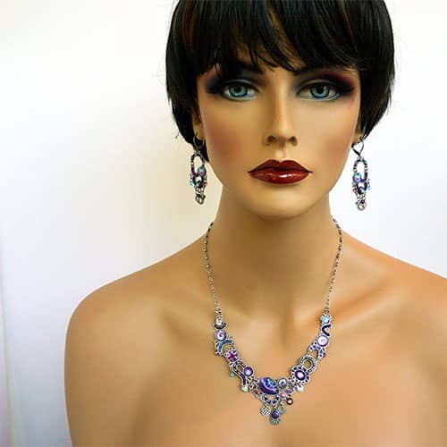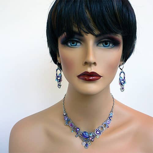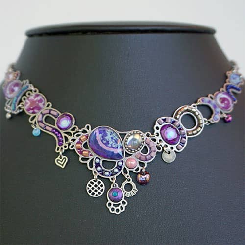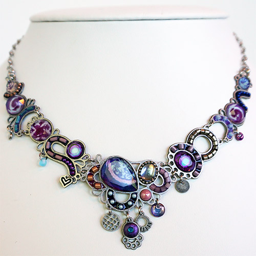 A very versatile necklace, adjustable from 15" - 20". The design is almost 6" wide. The center front measures 1.5" long. Very light weight.