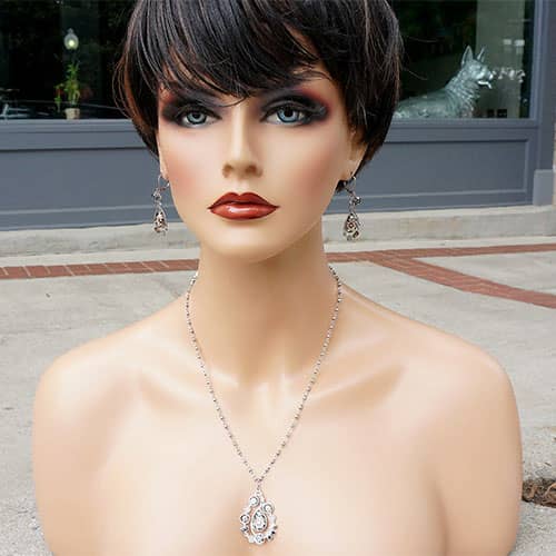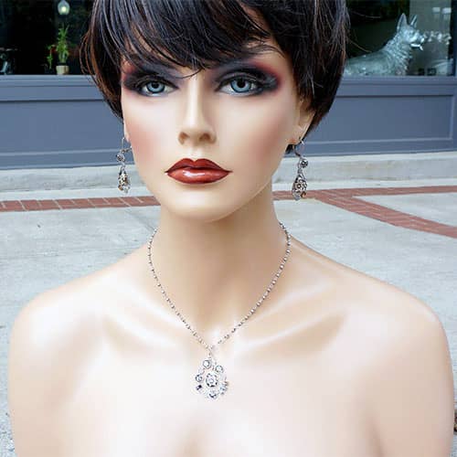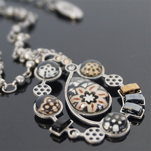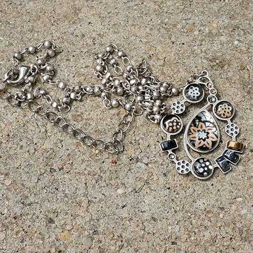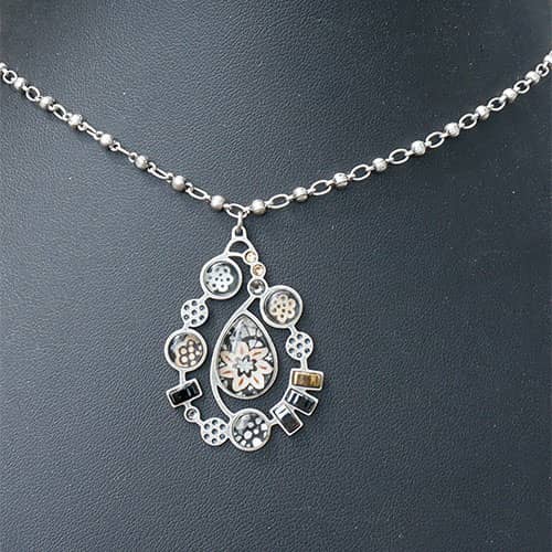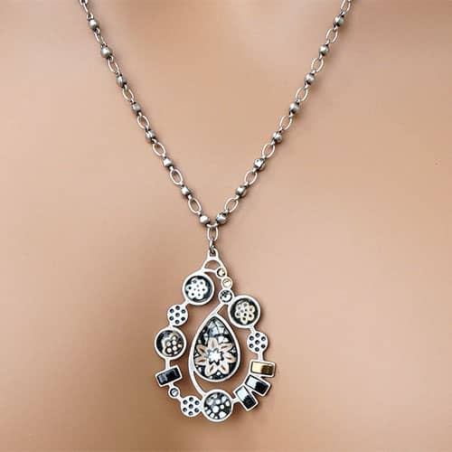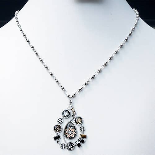 A very versatile necklace, adjustable from 17" - 20.5". The design is almost 1" wide and 1.5" long. Very light weight.